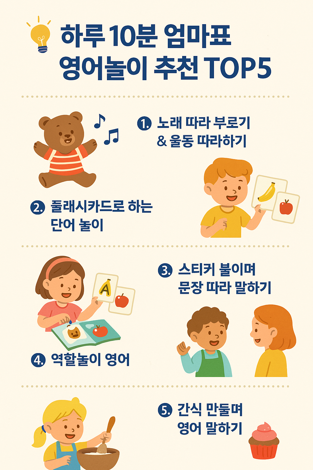 엄마표 영어 어렵지 않아요! 하루 10분이면 충분한 놀이형 영어 학습법 TOP5를 소개해요. 아이와 즐겁게, 자연스럽게 영어를 시작해보세요.
