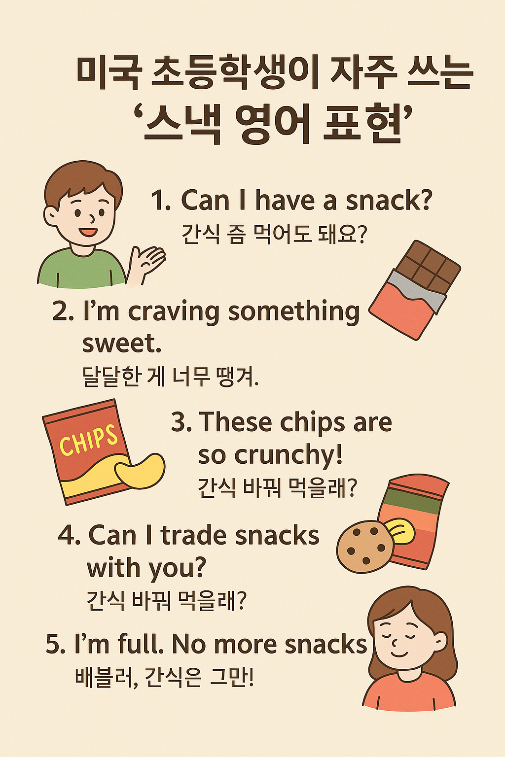 미국 초등학생들이 자주 쓰는 '스낵 영어 표현', 우리 아이도 자연스럽게 말해요!